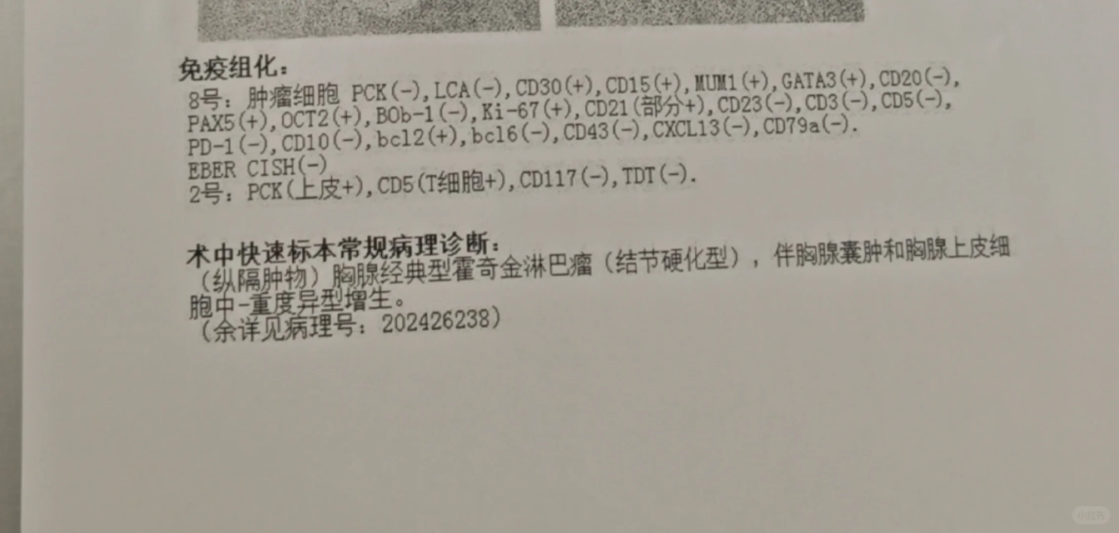 今天老公大病理结果出来了,不是胸腺癌,是霍奇金淋巴瘤,结节硬化型。虽然也是恶性肿瘤,但是比胸腺癌可要强多了。只要积极配合治疗,有治愈的几率。
